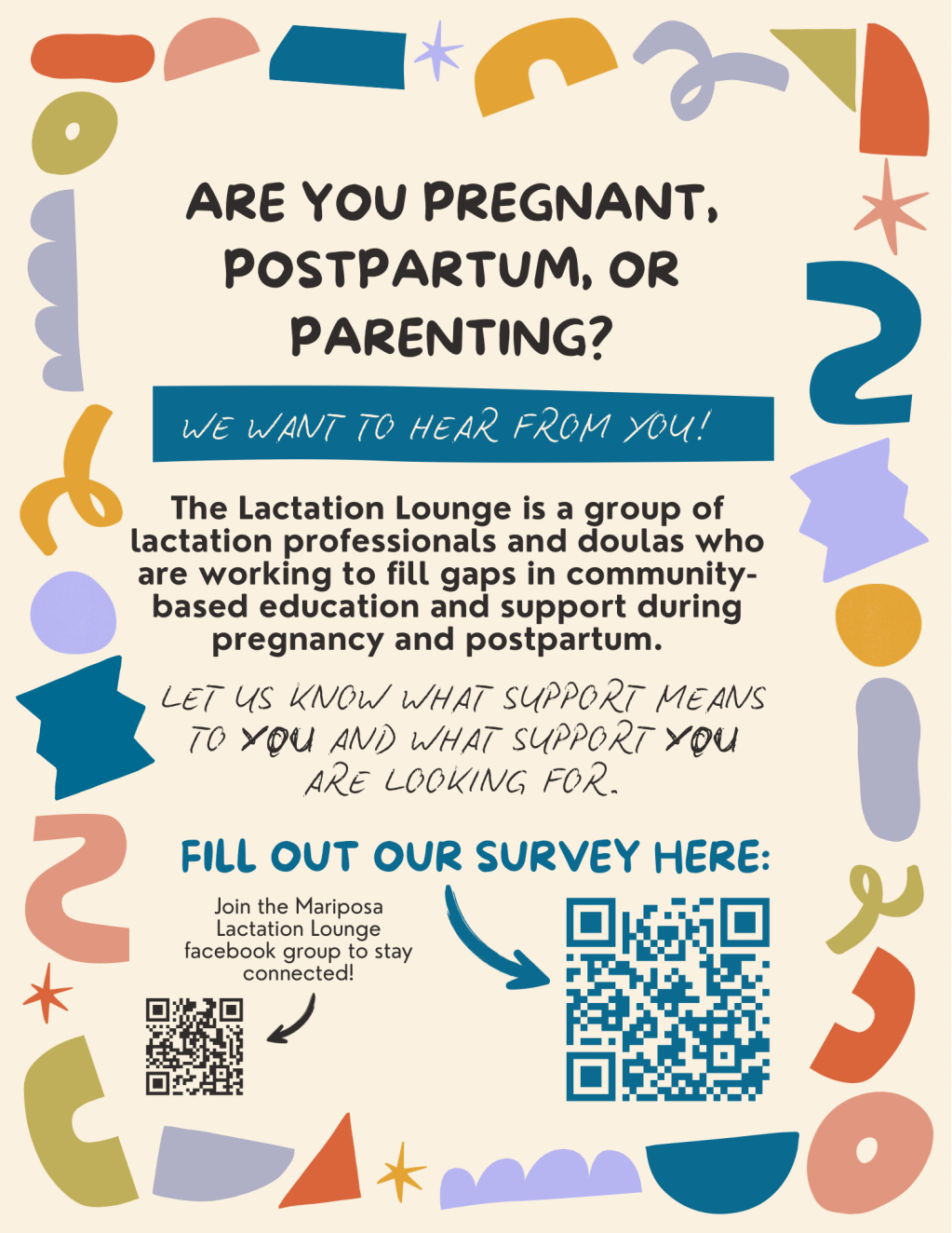 Are you a pregnant or postpartum mama? Would lactation services be beneficial to you? Please take this survey Mariposa Lactation Lounge: Community Survey.